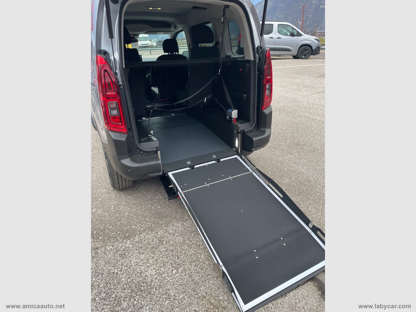 NUOVO Citroen Berligno con allestimento Olmedo 4 posti +1 carrozzina. Pavimento ribassato con rampa richiudibile in assenza del disabile per utilizzo del bagagliaio + sistema di ancoraggio della carrozzina regolabile a 4 punti + Cinturara di sicurezza a 3 punti per il passeggero su sedia a rotelle+Misure interne ai vertici della categoria. Sistema di accesso facilitato a bordo mediante RAMPA DI ACCESSO MANUALE.